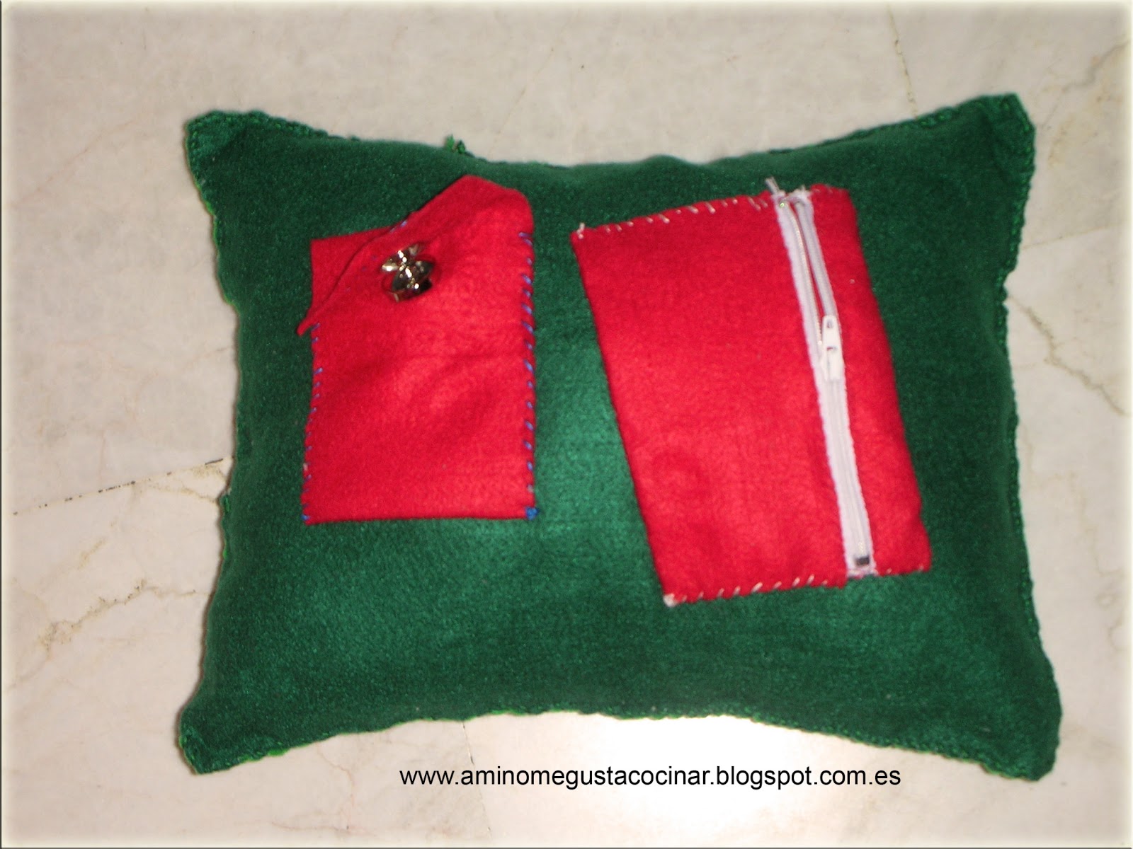 Me volví loca buscando por las jugueterías un puzzle para que mi hijo de 2 años aprenda a abrir y cerrar distintos tipos de cierres (para que empiece a acostumbrarse a vestirse y desvestirse solito). Lo único que encontré fue, en Imaginarium, una cosa que más o menos se parecía a lo que buscaba, pero el precio me pareció desorbitado para lo que era. Así que me pasó por la cabeza esa peligrosa idea de "esto lo hago yo". E igual que ejerzo de fontanera amateur (porque "para qué voy a llamar a un fontanero, si eso lo hago yo... no sé hacerlo, pero seguro que el chico de la ferretería me explica cómo"), pues me fui a la mercería que hay debajo de mi casa y compré lo que se me ocurrió para hacer este cojín. El diseño surgió sobre la marcha.